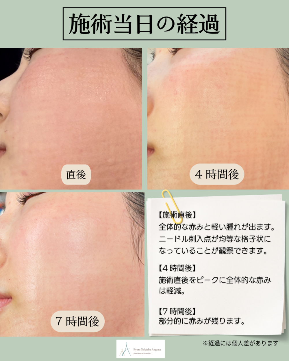 <施術翌日> 点状の赤みと、 部分的に内出血がありましたが、 翌日からメイクが可能ですのでファンデーションでカバーが出来ました。 顔全体少し浮腫みを感じました。